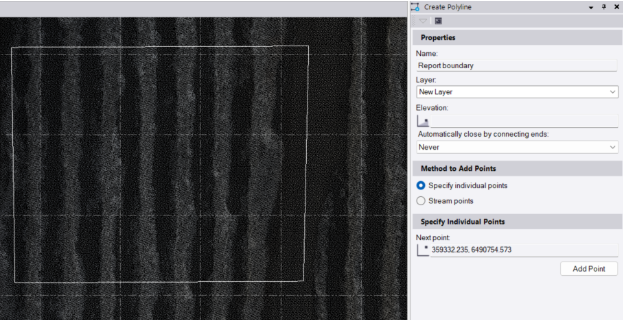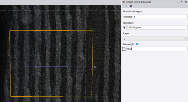 Select the point cloud region of the mine, select the boundary that you defined, and assign the breaklines that will be extracted to your boundary reporting layer.