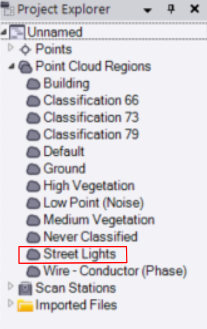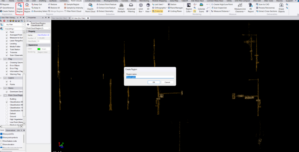 3. With your dataset open, select an object of interest you want to classify (in this case, a street light) and click on the now enabled “Create Region” button from the previous step. This will open a new pane where you can label this new point cloud region. After clicking enter, your new point cloud class will appear in the “Project Explorer” pane under the “Point Cloud Regions” Section. Furthermore, the object you selected will now appear in a new color to indicate that it is part of that newly created region.