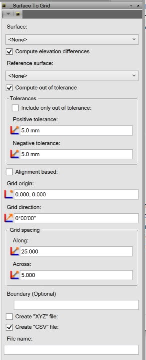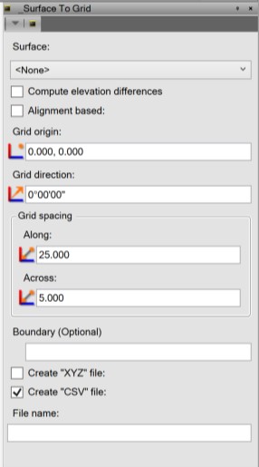 This TML will compute grid locations from a specified surface and write either (or both) an *.xyz file or a *.csv file. This can be useful for reporting purposes or to reduce the number of points in a surface.