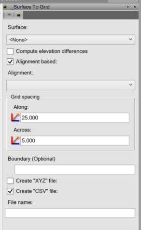 An option to compute the grid based on an alignment is available. When this is checked, the UI changes a bit. The grid locations are computed based on the station and offset to the defined alignment.