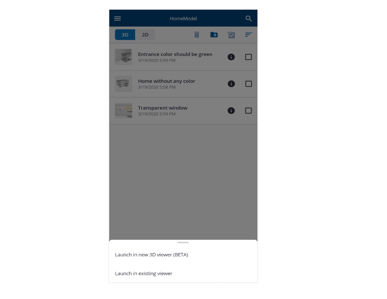 Support for .trb/.tekla file formats: These file formats can now be viewed in the mobile application. 3D views created from these file formats can also be launched from views list inside the project. Note that these files can only be in the new 3D Viewer.