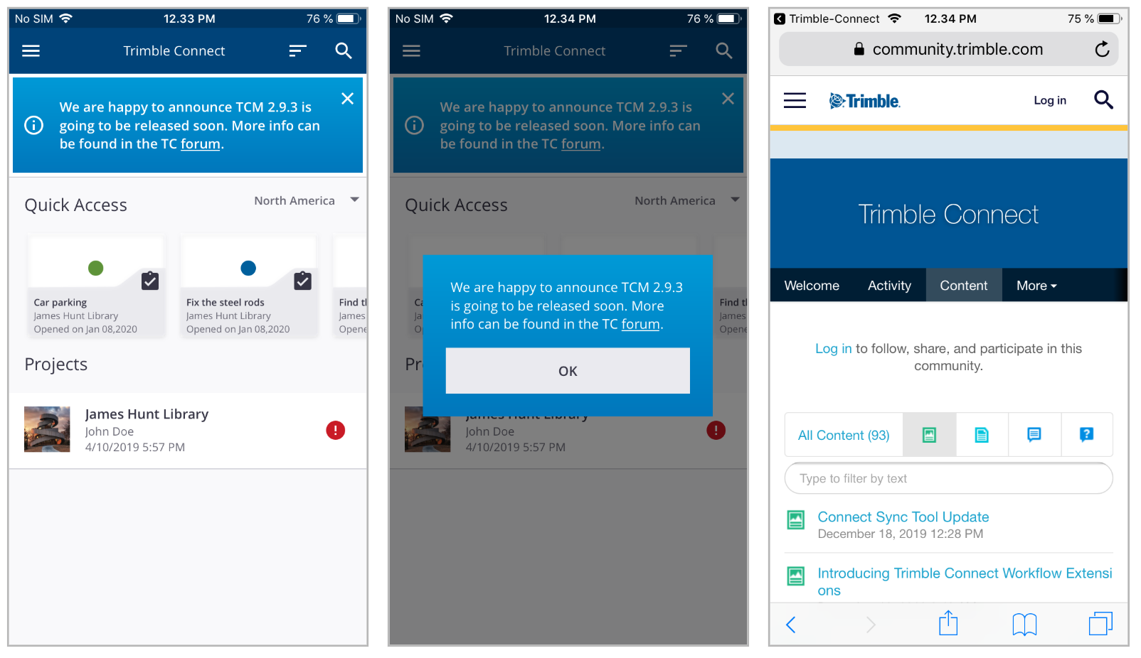 Announcements by the Trimble Connect Team will now be displayed with interactive hyperlinks (when available). When tapping the hyperlink, you will be redirected to the corresponding webpage. Any announcements with additional information that were earlier available only in the Connect for Browser application can now also be launched from the Connect for Mobile app.