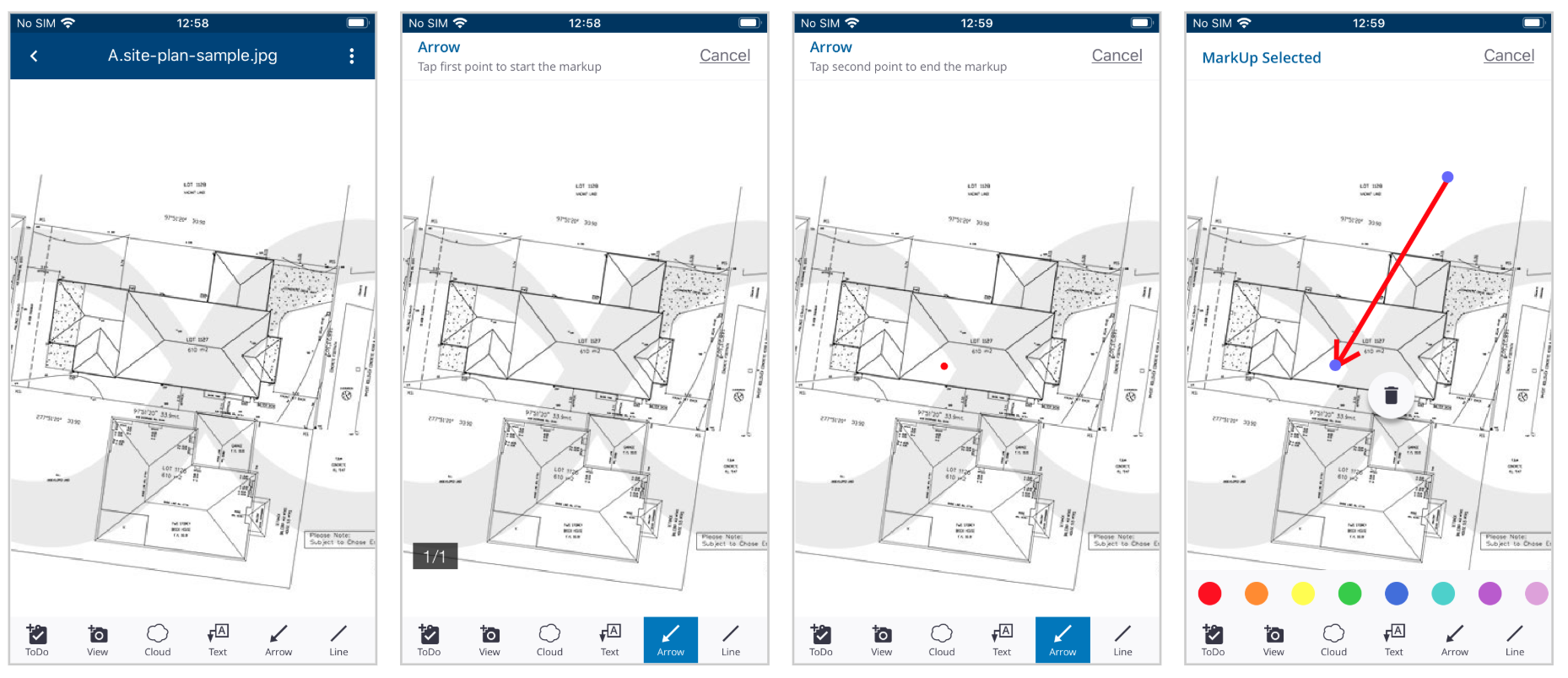 You can now create the Arrow and Line markups in supported 2D files using 2 taps, similar to the markups in 3D models. This enhancement allows for panning and zooming before selecting the second point. Created markups can be selected/edited/deleted as needed.