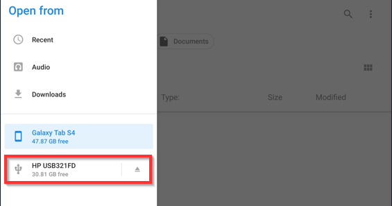 Use the 3 lines icon (top left) in the Android file manager to select the USB drive