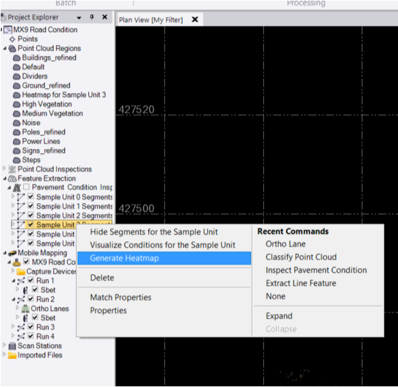 4. Generate a Heat Map (Optional): To visualize elevation differences, uncheck the "Pavement Condition Inspection" node in the Project Explorer, then select all sample units, right-click, and choose Generate Heatmap. Confirm the settings in the command pane and click the "Generate Heatmap" button. You can toggle the heatmap and its legend on/off in the view.