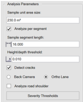 1. Review the "Analysis Parameters" section. While default values are often sufficient, note settings like "Sample unit area size," "Analyze per segment" (ensure checked for detailed localization), "Sample segment length," and "Height/depth threshold". If Ortholane was generated before beginning, select ‘Detect cracks” and click Ortho Lane.