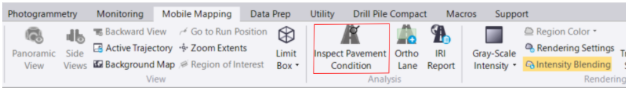 2. Now that Ortholane imagery is generated, navigate to the Mobile Mapping tab, then select Analysis > Inspect Pavement Condition to open the command pane.