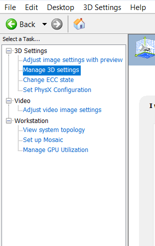 2. Manage 3D Settings: Once the NVIDIA Control Panel opens, select "Manage 3D Settings" from the "Select a Task" panel.