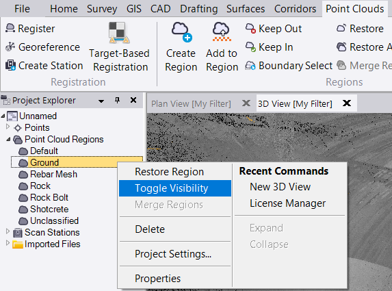 Select the point cloud region for the tunnel by clicking in the selection box and selecting the point cloud from the Plan View or Project Explorer.