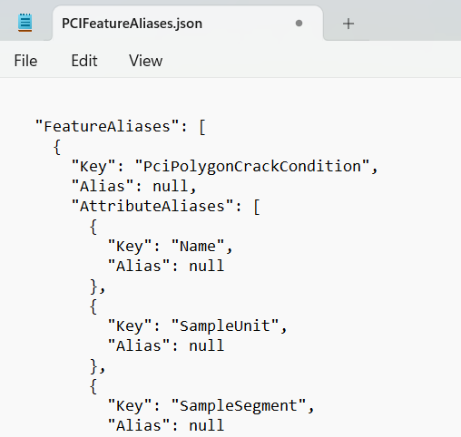 If you decide to use different feature class or attribute names in ArcGIS, make the corresponding changes to the ‘alias” properties in the (PCIFeatureAliases.json) file that can be found at: