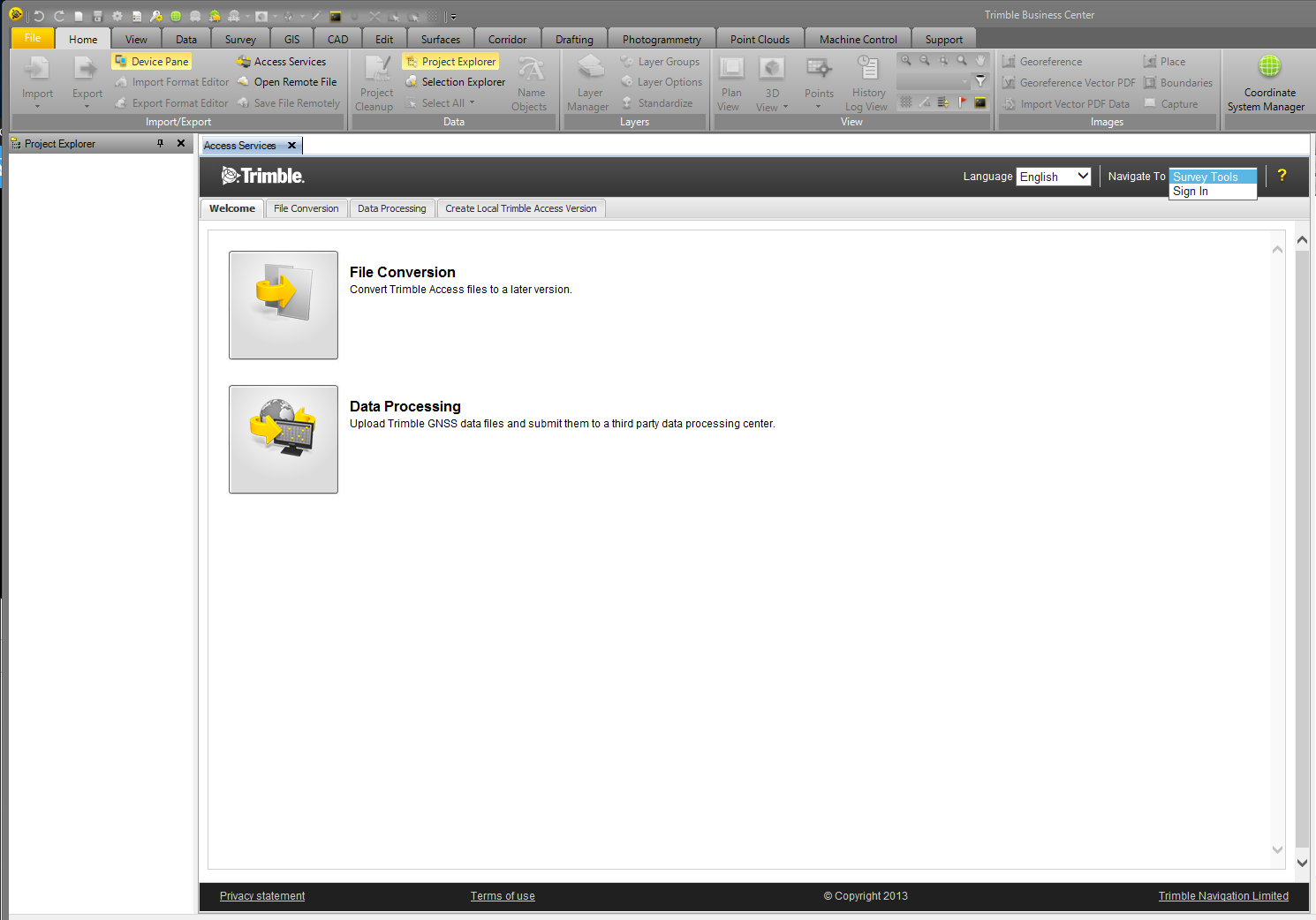 For data processing on Trimble Business Center, you do not need a login to use Trimble Access Services. In Trimble Business Center, select Home tab and click Access Services. When the screen loads go to upper right corner and change 'Navigate to' drop-down menu to 'Survey Tools'.