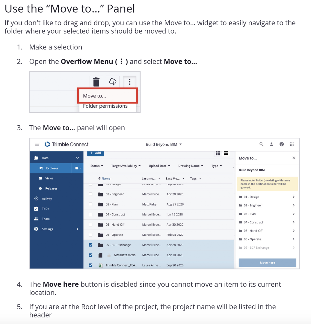 Thank you for your reply. You could take as an example Google Drive and see how it works there. One can right click on a file and select to move (copy, rename, delete files) from a menu or select it from options on the right top bar. This is done in a similar way in Trimble Connect (similar icon with dots) but the option is missing.