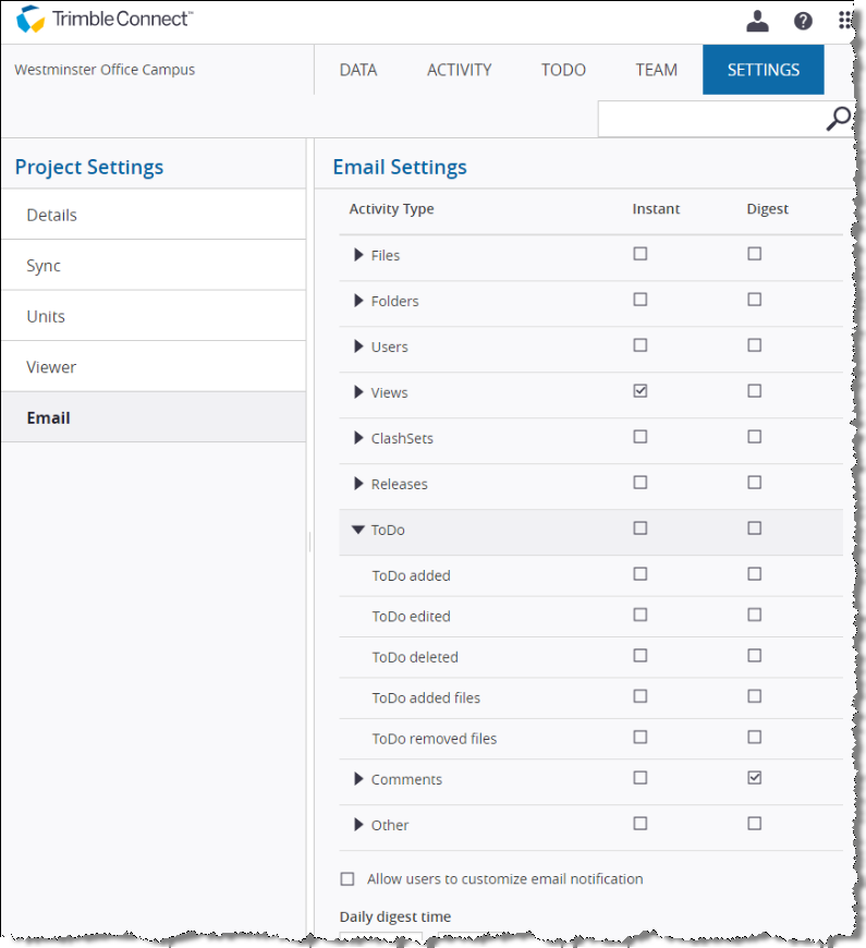 ToDo notifications are configured in the Project SETTINGS page and will be sent to the users assigned to that project.