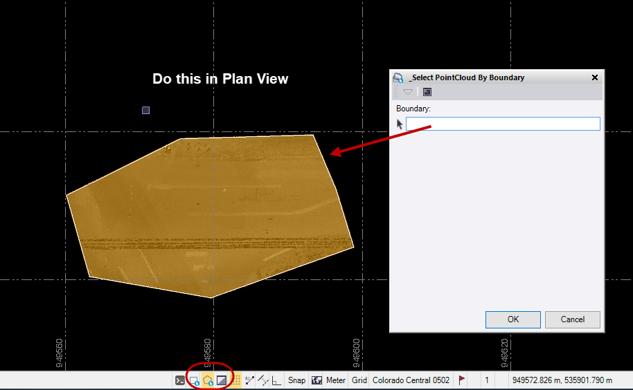 If you have the Macro tab in the ribbon, go there and choose PointCloud by Bndy. It asks for a boundary such as a polygon or any closed linestring. You have to be in the Plan View and in the Polygon Select mode.