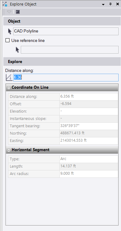 You can use Explore Object command on an Arc included in a Linestring and if you click on the arc segment it will give you property data as shown below about the Arc (Length and Radius) if those are the measurements you are asking for?