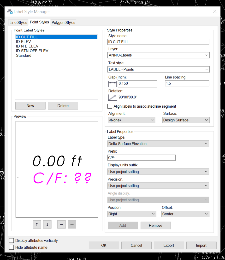 The Elevation is of the Point and the DElv is the Cut Fill from the Point to the referenced surface.