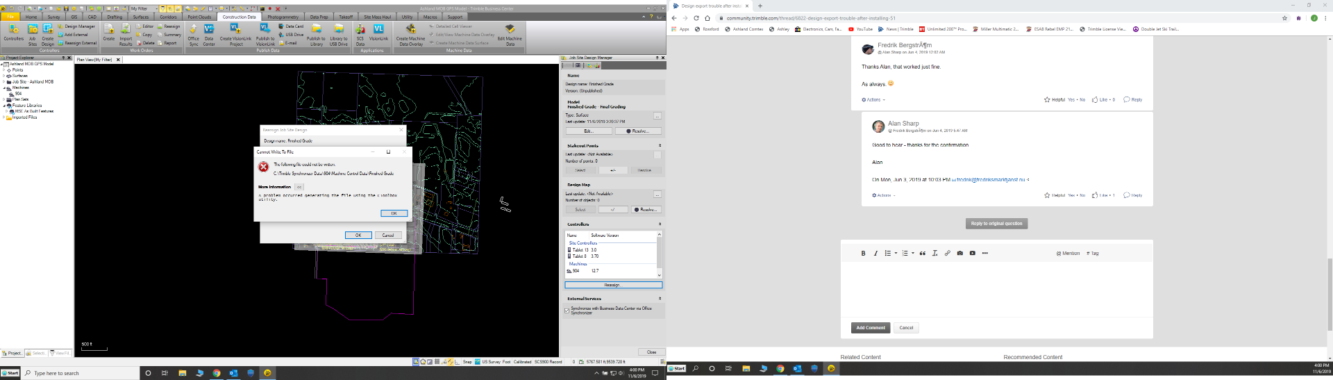 I am in Ohio. I have already been in contact with Brad and Ben with Sitech Ohio for about a week. I have been working around this by exporting a .XML surface and .dxf linework and using the data collector to export the .cfg and then importing into a completely different computer with business center and then exporting it out to only machines.
