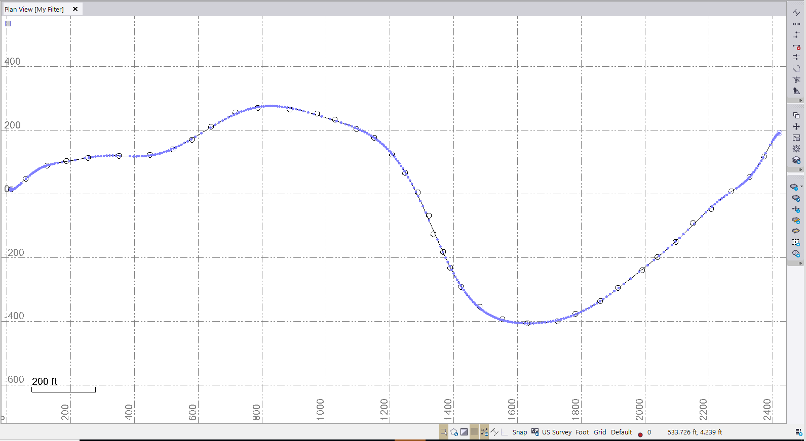 I also tested this by creating a HAL VAL with Real Geometry, then created points at 5' intervals along the line in 3D and then ran Best Fit Line to those points and it looks like it fits to better than +/- 0.3' (Hz) or +/- 0.06' (Vt) over the whole length of 1900' that I tried - this is a pretty good fit (but Chorded). Obviously with curves the results would differ but I am interested to see what we can do (see below)