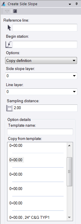 - Use the Create Sideslope command to create a series of offset lines at defined offsets and slopes from the selected source line. This is a good command because you can create and store templates that can be used on any 3D Line to create a series of offset lines to represent all of the curb feature lines.