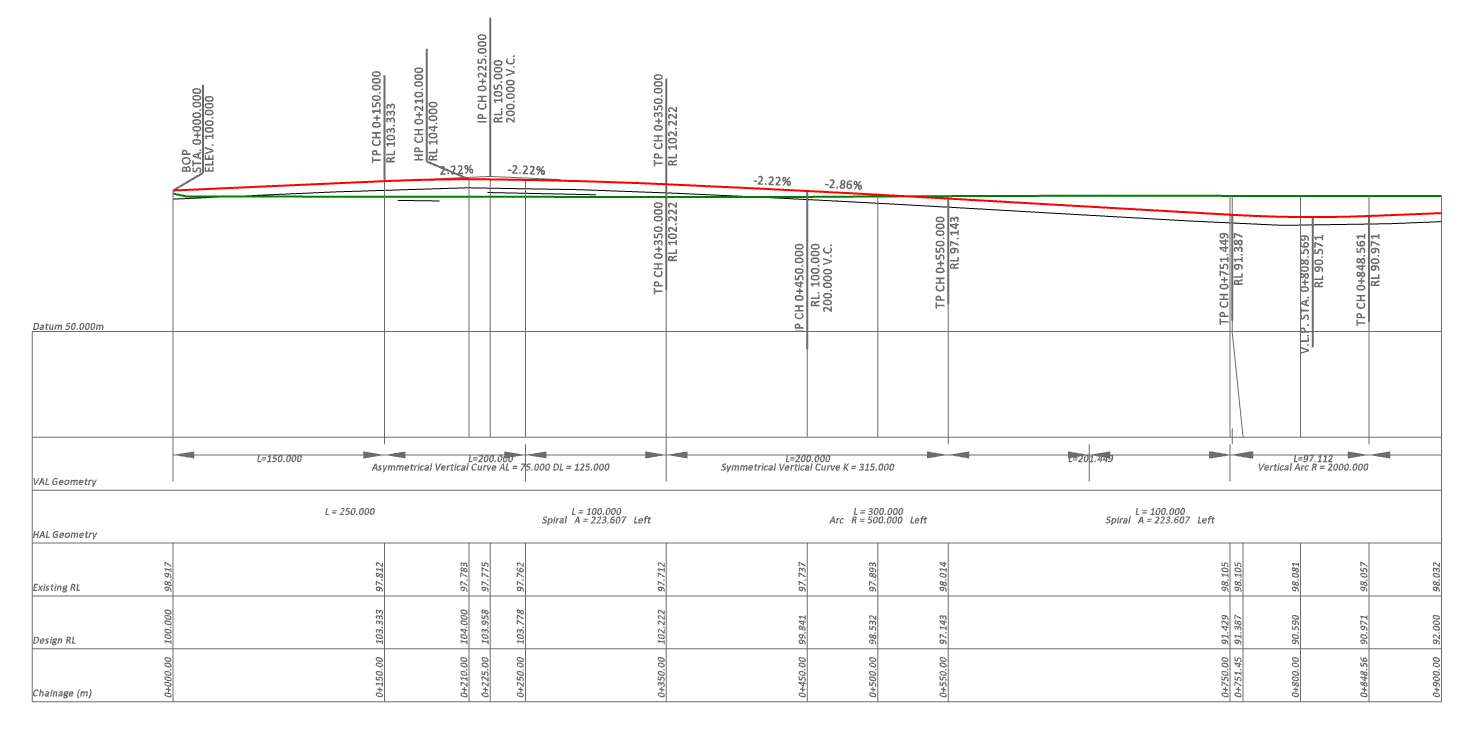 - Now other settings you make will dictate how much space will be consumed by the table below the profile - ie the Kink Row Height (this kinks the drop lines so that text in the tables do not overwrite each other in the table below), row height (each label in the table goes in a row, each row has a row height to accommodate the labels), the number of table rows you want (for the values like Station, Elevation, Cut Fill, HAL Geometry, VAL Geometry etc. Each addition you actually draw will consume space below the profile, however turning these on will likely overwrite on the Grid (and this is the area where I doubt you will get a good solution as Grids and Tables were not designed to work together.