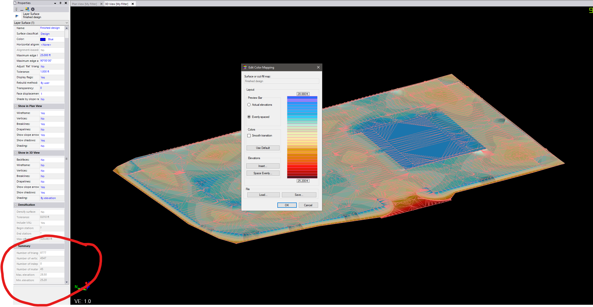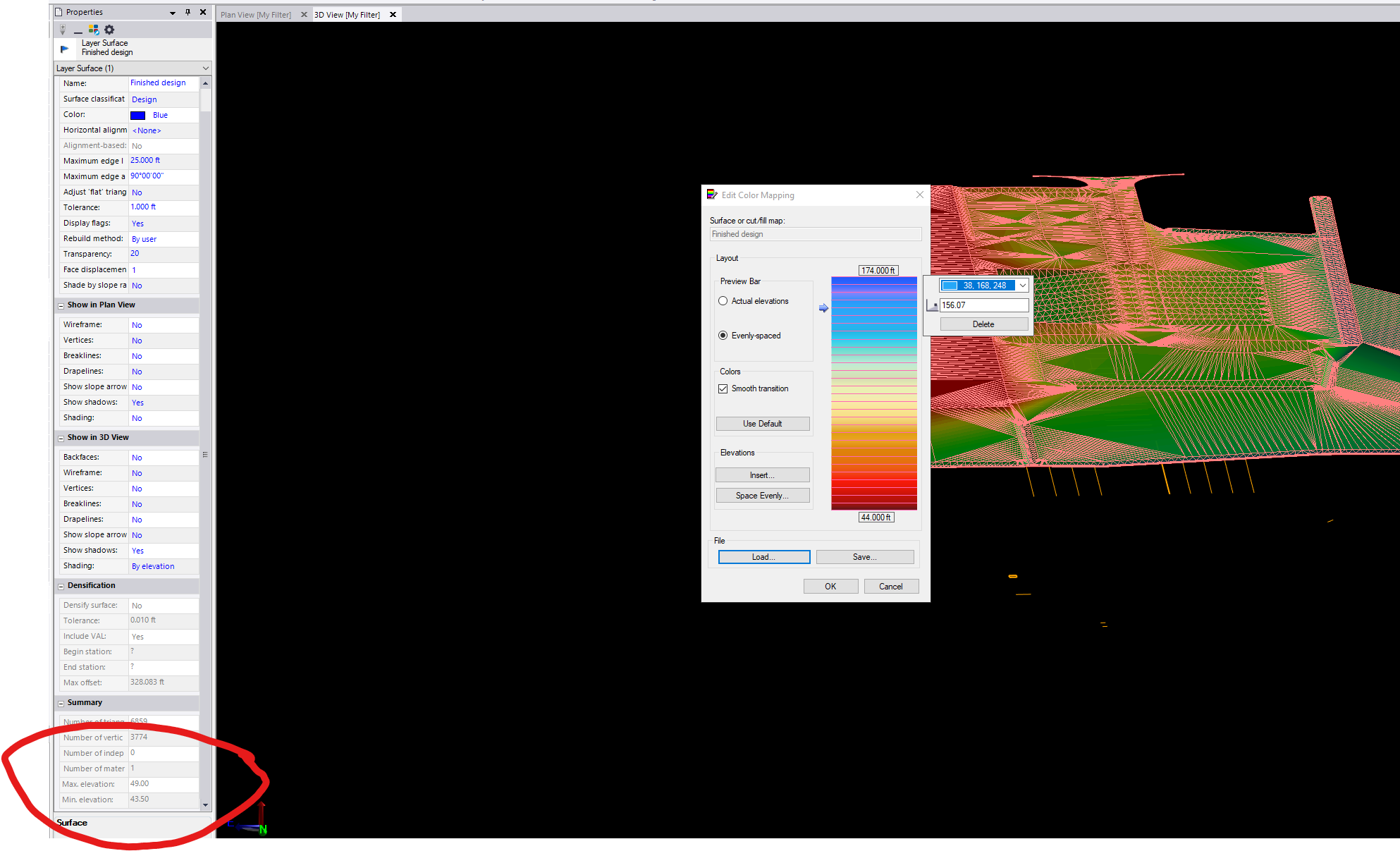 I often use color mapping templates that Alan posted a while back. I found that sometimes the max/min elevation sets itself to the elevations in my surface, and sometimes defaults to a different elevation (-174' min 174' max if I remember correctly). I can't figure out if I'm doing something wrong or if this is a bug. It seems to be random. Nearly all of my work is below 100' in elevation so I either have to use the default color mapping when this happens or map my own colors. Any ideas?