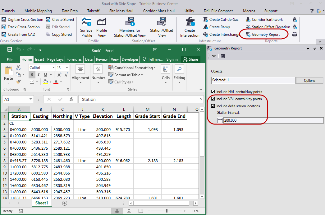 From the Corridors tab -> Geometry Report, you can type in the station interval and create a report as below. Would this work?
