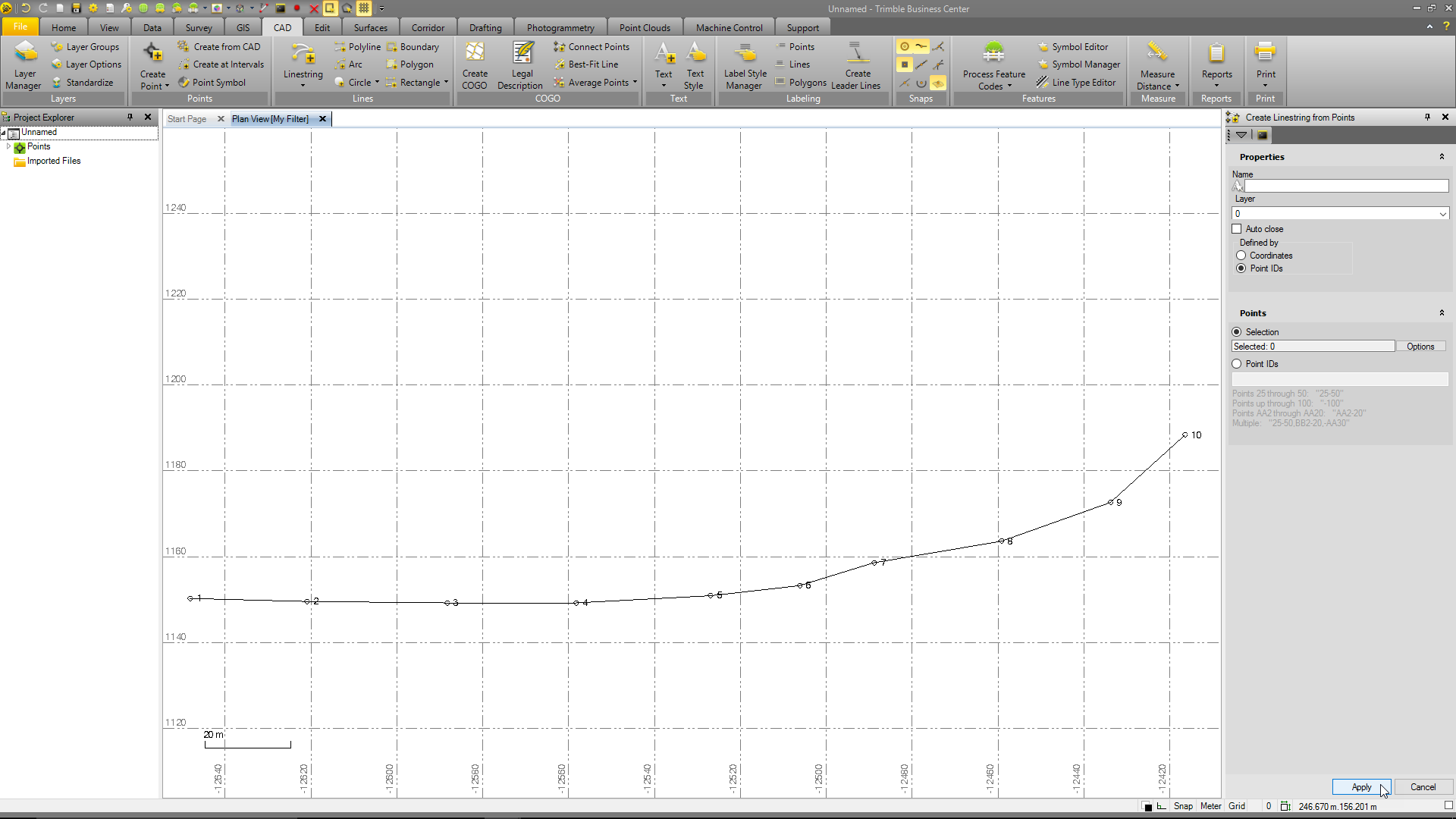 If you are not using a feature code library, you can use the "Connect Points" command with the "Advanced Select" command to automatically create a line between the points.