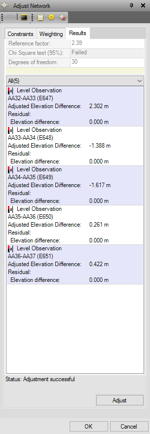 While in the network adjustment you can also view each adjusted leveling observation by selecting it in the Project Explorer and seeing the results in the Adjust Network command. In the weighting tab you can change how leveling observations are weighted as well in the constraints tab allows for adjusting the standard error of your control benchmarks.