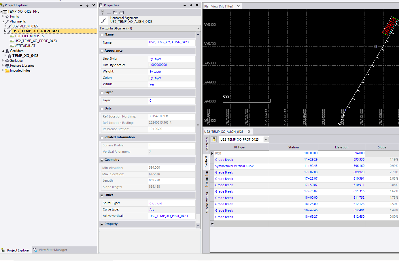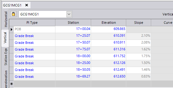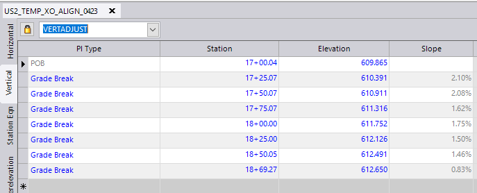 When i perform the "Trimble Access Road Strings" export and re-import the new .crd file into TBC to check, the new alignment definition is changing one of my vertical curves from symmetrical to asymmetrical. Once asymmetrical, it gives a departure curve length the exact distance to the the next vertical curves VPC. Prior to exporting, the symmetrical curve is only 750 long, after the export it is reaching over 3000' to the next curve and removing tangent section of line. I also notice that the .crd definition is adding a grade break at the VPC of every symmetrical curve, i am unsure if there is significance to that as well. The remainder of the alignment is technically a match (even though additional definition) with exception to the asymmetrical curve.