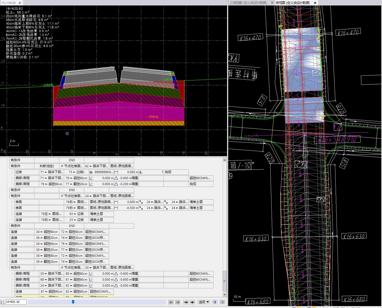 我需要计算道路完成面以下的材料层工程量,图纸中说明,1、填土高度H<1.53M,清除表土开挖至路床底面标高后,向下反挖三层共计60cm,采用4%石灰改善土换填,再向下翻挖一层20cm,原地掺4%石灰改善。2、H>1.53M,清表50cm,挖至路床底层。路床80cm分别为40cm下部6%灰土层,40cm上部8%灰土层,路面结构层。I need to calculate the engineering quantity of the material layer below the road completion surface. It is stated in the drawings that 1. The filling height H<1.53M. After removing the topsoil and excavating to the bottom elevation of the roadbed, dig down three layers for a total of 60cm, using 4% Lime is used to improve soil replacement, and then a layer of 20cm is dug down, and 4% lime is added in situ for improvement. 2. H>1.53M, clear the surface by 50cm, and dig to the bottom of the roadbed. The 80cm roadbed is respectively 6% lime soil layer in the lower part of 40cm, 8% lime soil layer in the upper part of 40cm, and pavement structure layer.