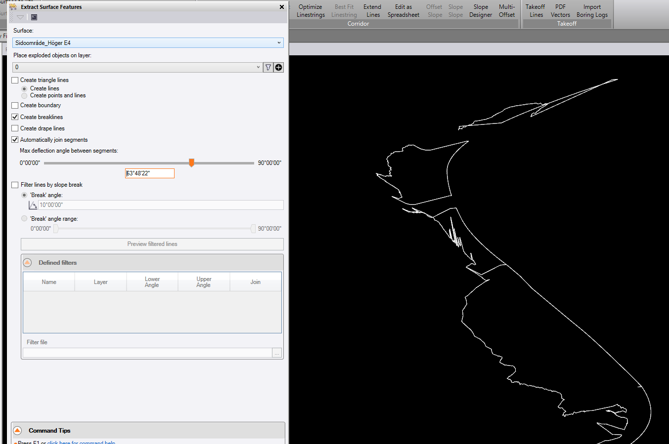 My problem is that i want to extract lines from a surface (they are alingned wit the center line) but if i use explode surface it will only give me part of the lines and som lines i dont want. But if i use corridor and add the surface as a instruction i can see marks in the xs for the nodes but i cant use them, if i could i would get exactly what i want. Any ideas?