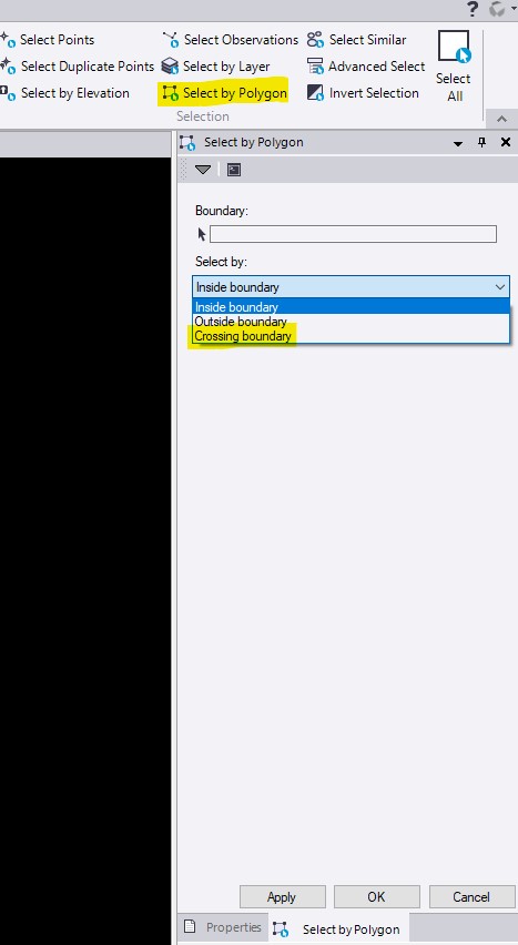 There is a way to select points along a line but it may require a sequence of operations. The "Select by Polygon" tool that usually lives on the "Home" tab has a mode called "Crossing Boundary", and it will work to select anything touching a line, and the "Boundary" object doesn't have to be a closed line. The behavior is that it will select all objects touching the line. You can then filter those objects down to only the points, e.g. using the Selection Explorer or the Advanced Select tool. There is no tolerance option, so it will only select those object directly touching.