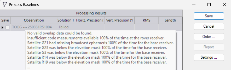 Al procesar una linea base entre dos puntos, me da como solucion "fallida" y no puedo obtener la causa, solo el mensaje "No se encontro datos superpuestos validos", cuando ambos registros se realizaron simultaneamente y puedo observarlo en sus datos.