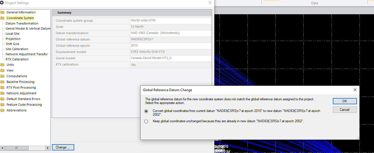 Backstory, field crew used the wrong epoch (2010) for a site. They set up a base with a known NEZ (previously processed to CanNet @ epoch 2002), and staked some points. When importing the field work to do some checks, I notice they used the wrong epoch, and switch it to the correct one, then I get the below dialog box.