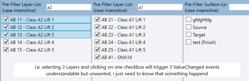 have you got an idea/suggestion how I can avoid being hit by potentially dozen/hundreds of events if I change the check state for multiple tick boxes in a Trimble.Vce.UI.Controls.Wpf.CheckedListBoxEntityPicker?