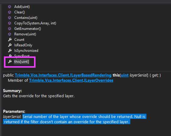 activeForm = TrimbleOffice.TheOffice.MainWindow.AppViewManager.ActiveView activeViewFilter = self.currentProject.Concordance.Lookup(activeForm.ViewFilter) loverrides = activeViewFilter.LayerOverrides[8] # test with serial for layer zero loverrides.Visible = not loverrides.Visible # test just negating it's current state