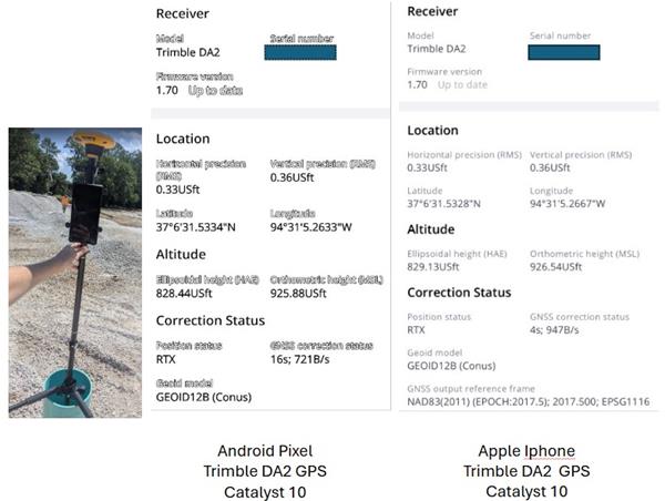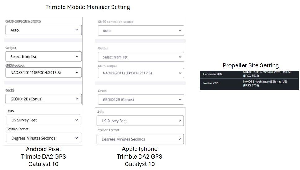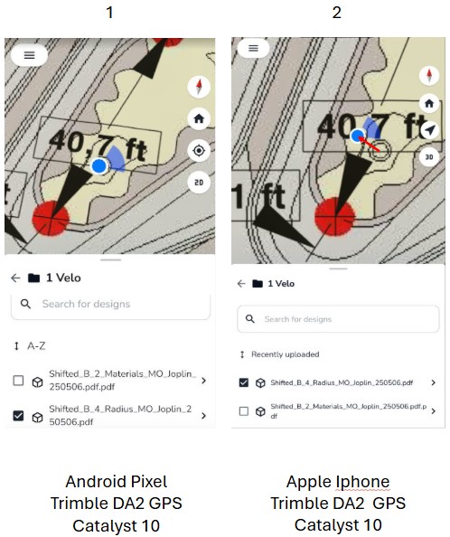 We are using a catalyst 10 subscription and DA2 utilizing mock location with the Propeller mobile app to do rough layout of features. We have found that when we look at the position in the Propeller mobile app on an iphone versus android device they show up in different locations. In the image below you can see the blue dot (pole location) using the android device is centered over the circular drain location. However using the same subscription and hardware using an iphone it shows the same position shifted up and to the left indicated by the red arrow.
