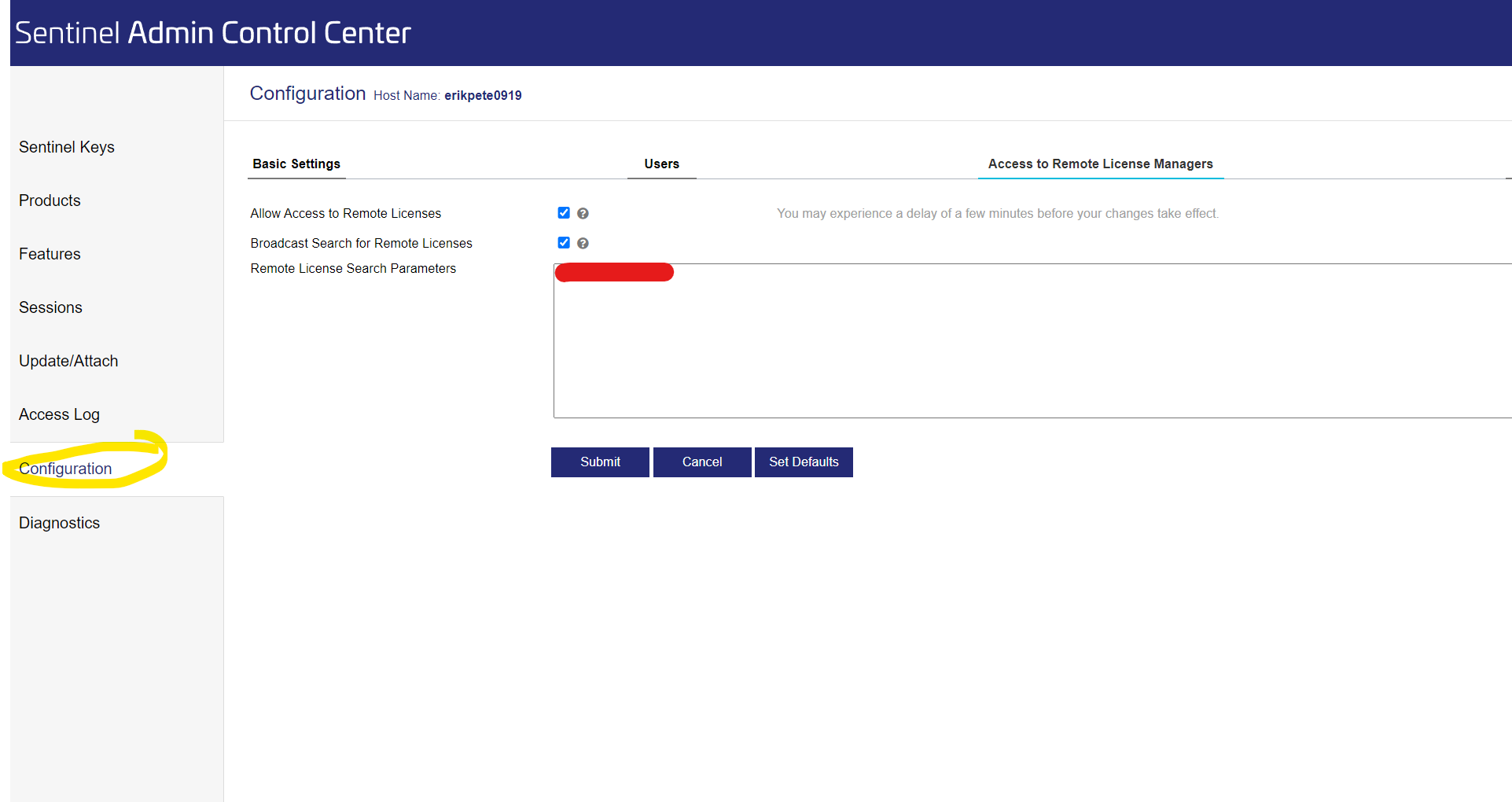 Look under your computers Sentinel Admin Control Center License Manager>Sentinel Admin Control Center and does it have a IP address under Diagnostics>Access to Remote License Managers?
