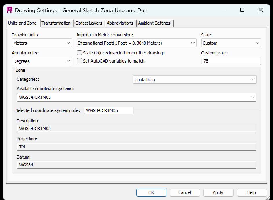 I have an autocad drawing from my surveyor in Costa Rica (I live in the United States). When I import the cad file into trimble and change the coordinate system to the correct settings. Trimble maps still can't verify the coordinate system correctly. I'm not sure what I am doing incorrectly... My co-worker tried it in Autocad and everything worked perfectly fine. Below is a screenshot of my coordinate system setting in TBC and the coordinate system settings in Autocad. Any help would be wonderful! Thank you