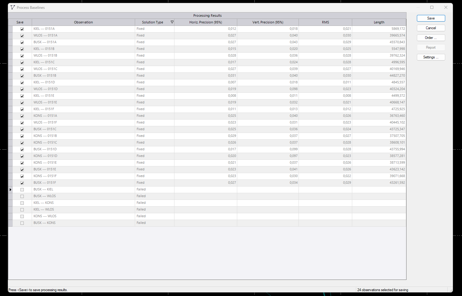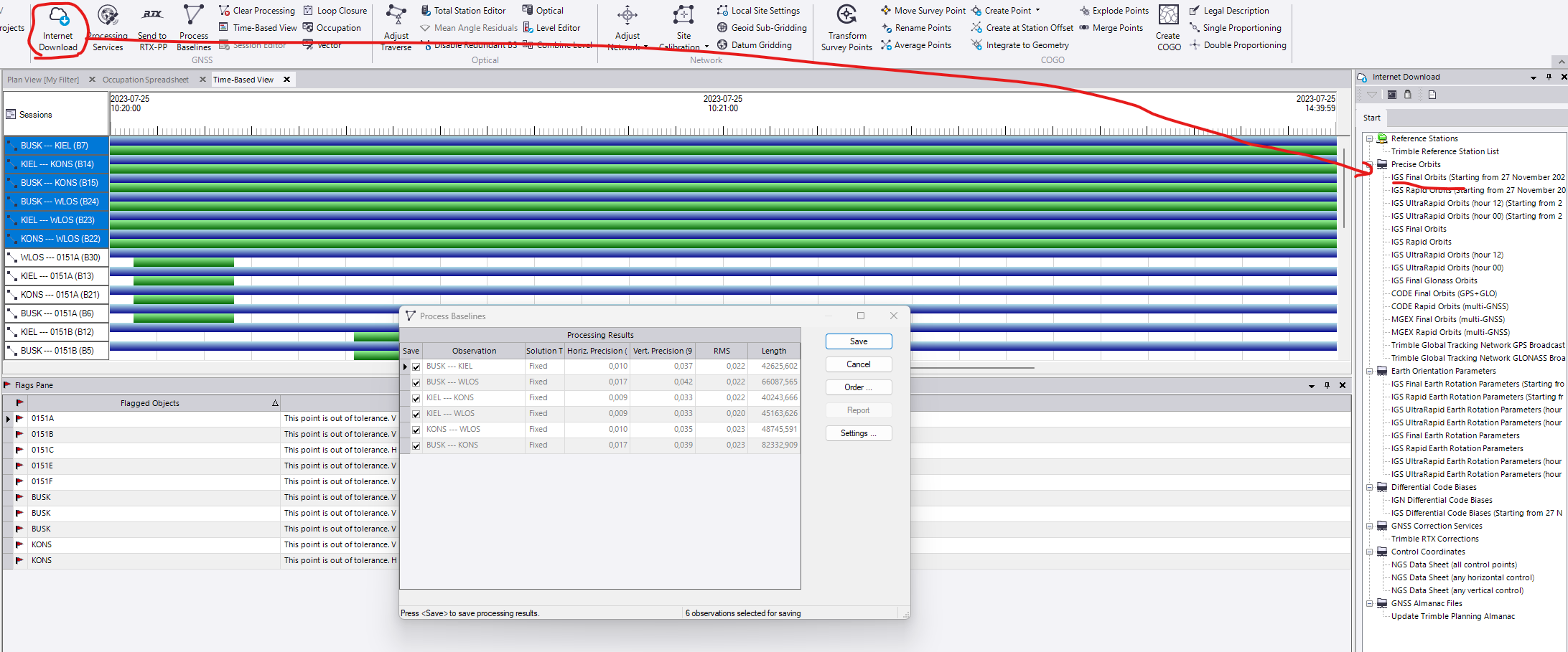 I ran Process Baselines on your project and had issues with some of the baselines but not all of them. For me it says that the ephemeris data is not available and it's for the CORS stations I guess (BUSK to KIEL, BUSK to WLOS, Kiel to KONS and so on).