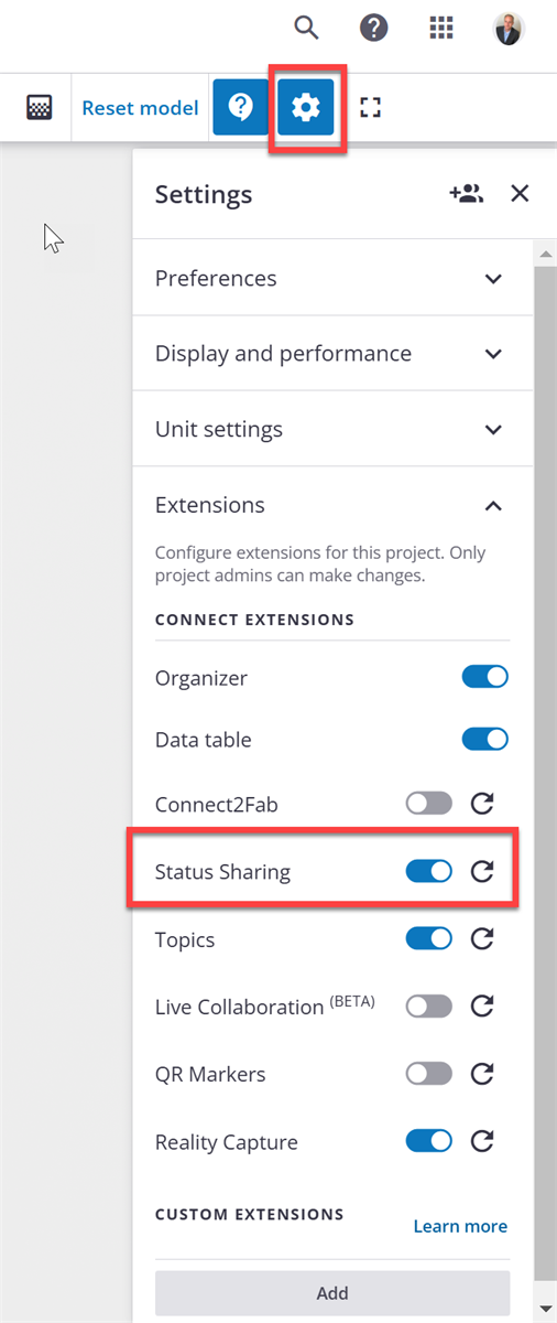 I've encountered strange issue with status sharing for Trimble Connect web app. I have 4 projects with settings/project details set alike. For one of the projects, status sharing icon is not visible for web app, however Android App, Windows App and 3 remaining projects works fine. Could you please advise how to make it visible?