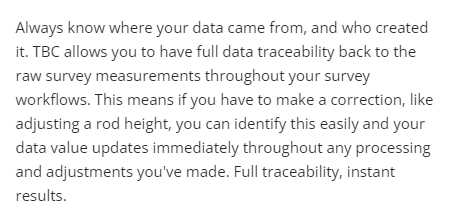 Screenshot from the main TBC product page on Trimble's website.In any scenario involving sonar data TBC fails to provide the above-mentioned "full data traceability" and access to raw data functionality.