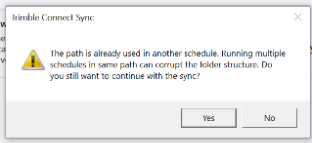 The SYNC path specified [actual path here] is used in another Project Sync Schedule. Running multiple sync schedules to the same path MAY result in corruption of the data or folder structure. Please confirm Sync setup including Sync direction (Upload vs. Download) before proceeding.