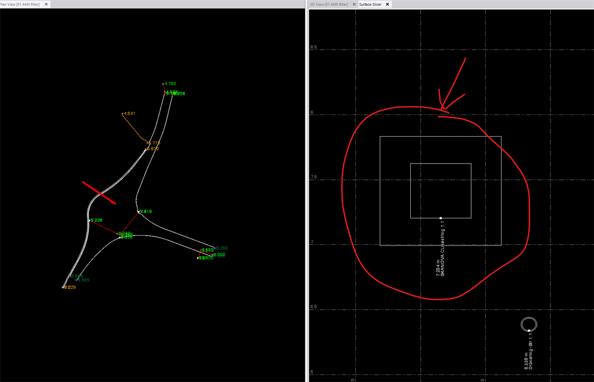 When reimporting the landxml file into TBC, the software honors the line which the user defined shape is extruded along but the user defined shape doesn't translate correct, see picture below.