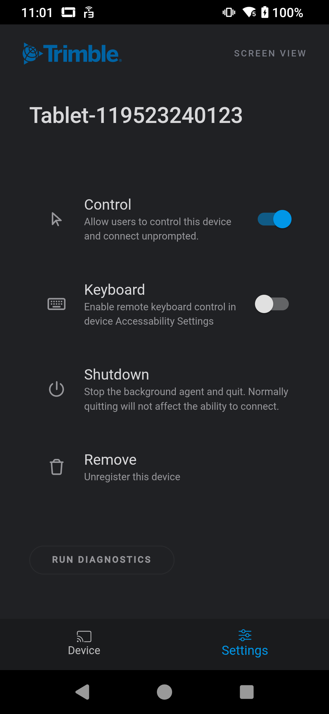 You're going to have to go in to the "Screenview" app on the device itself and enable some permissions to allow remote control.