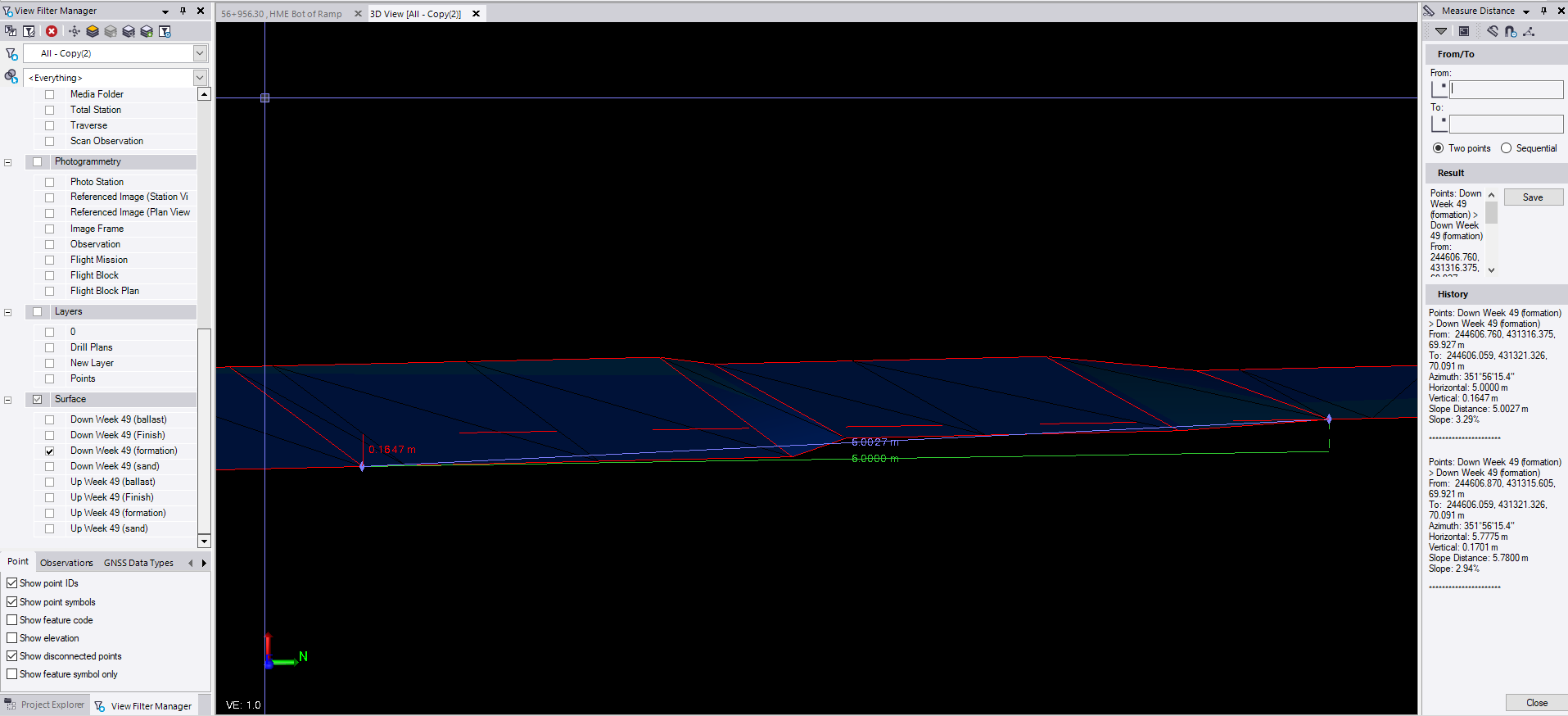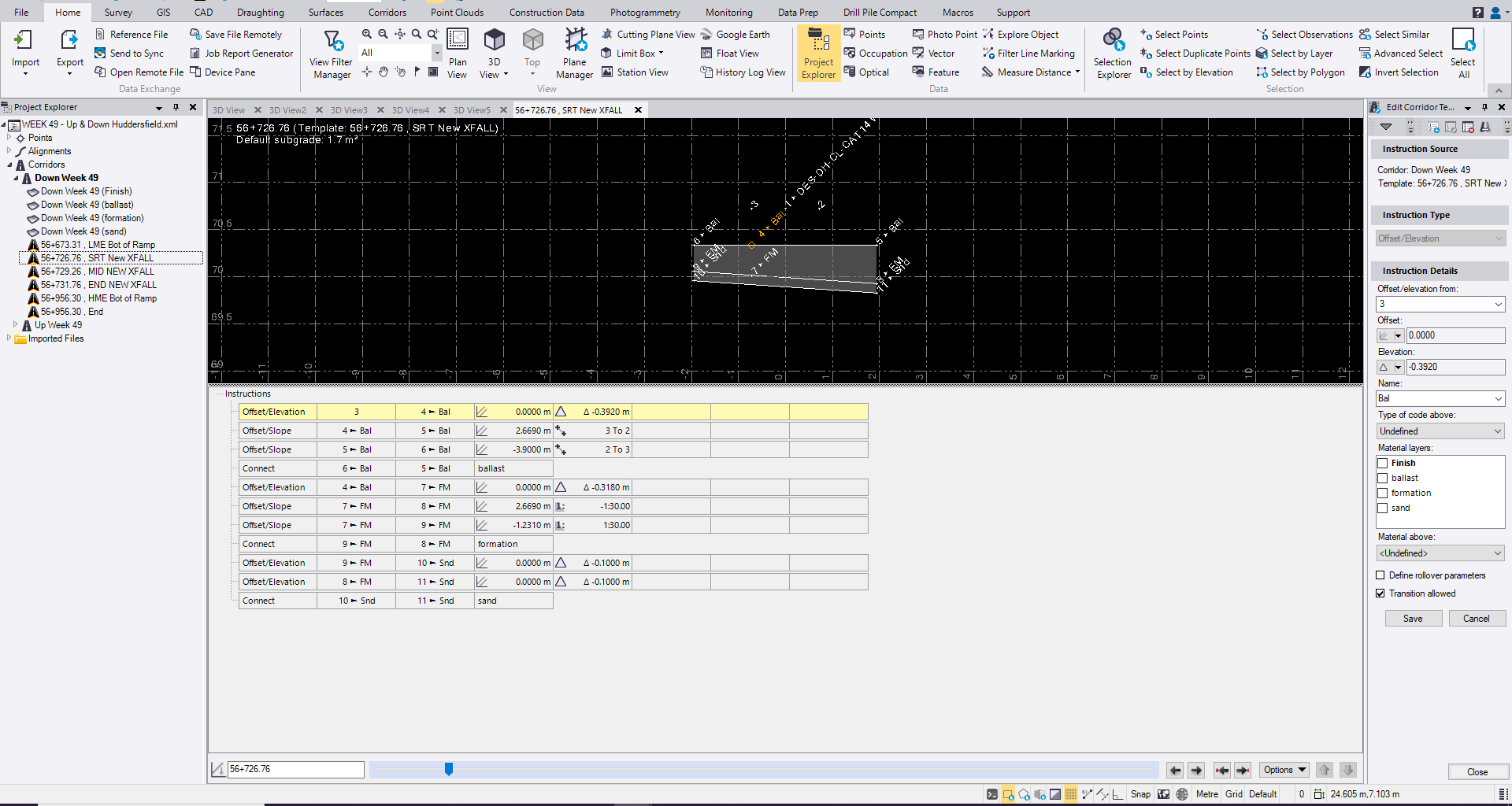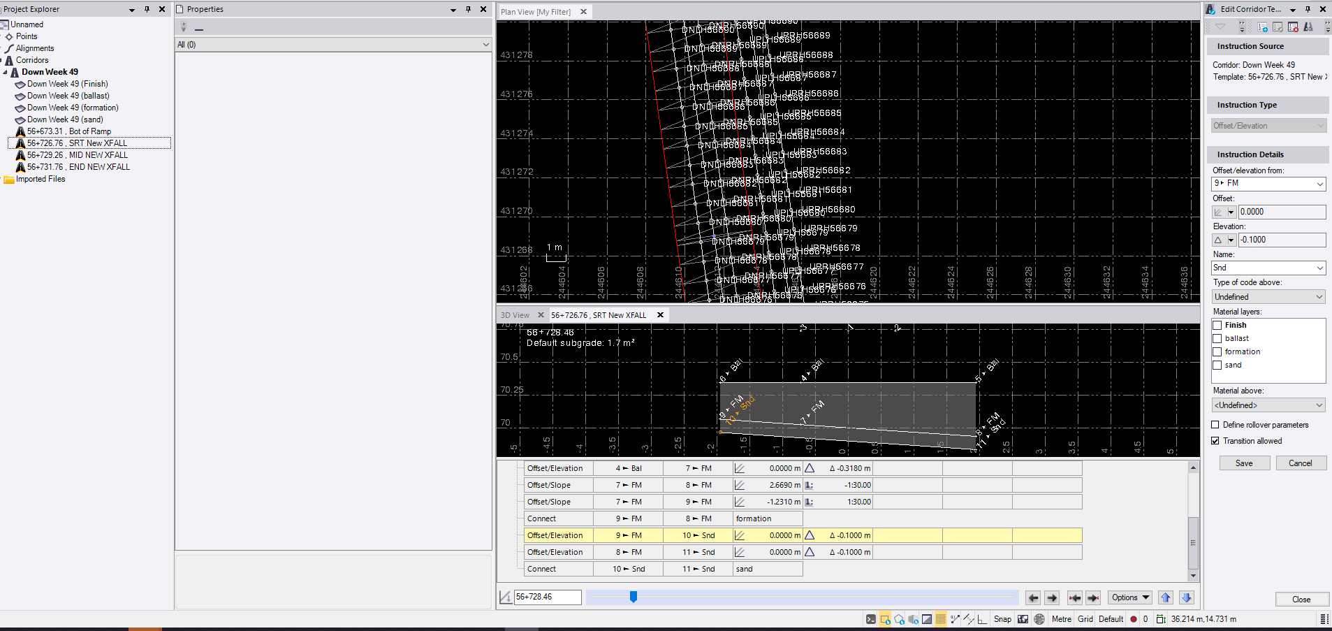so the start of the formation is a 1:30 crossfall to the right hand which transitions over a 5m length to the left hand side. The width of the ground works remains at 3.9m througout. i expected this to be a smooth transition interpolated between the two templates and found it to be irregular. As below it looks like there are areas of abrupt and subtle formation change.