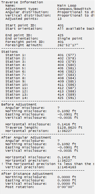 I am working on a traverse adjustment and I get distance errors as expected, but there is no angular adjustment happening at all. I'm not sure how to get TBC to recognize the angles between each leg. It knows the distance, how does it not know the angular errors? Very frustrating, if anyone has any input, would greatly help. It is only doing a distance adjustment which does not solve the problem. Attached is some more info but I'm not sure what to do. My colleague collected this data on Survey Pro and was exported using a .job file. I'm not sure how it can fail to calculate the angular misclosure. The entire report just has "?" for anything related to angles.