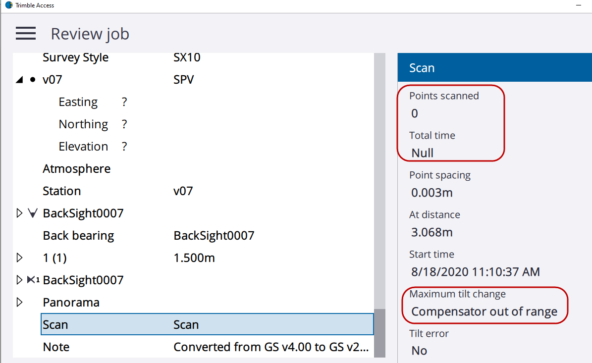 In a project I've made 7 scans (all 'scan station'). After import in TBC, I've got only 6 scans, but a warning that a scan could not be imported: