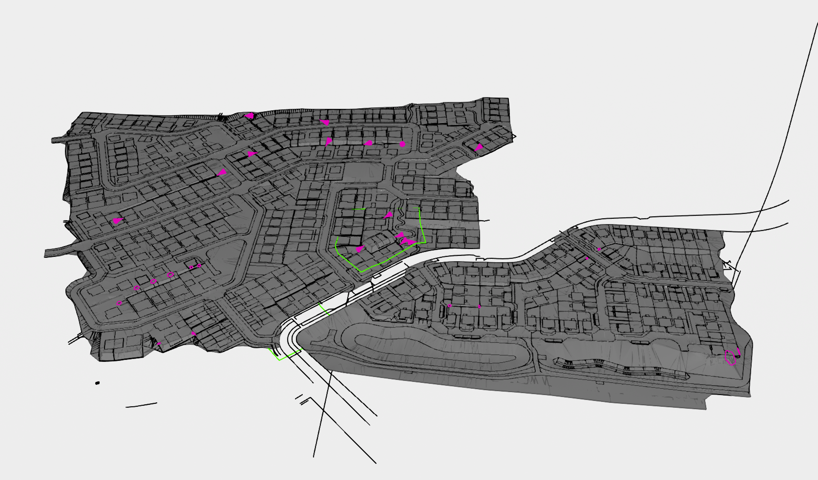 arrow markup 3. Check versus CAD design. Appear to fall opposite road. - reply: Checked - as per design.