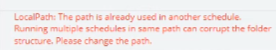 The SYNC path specified [actual path here] is used in another Project Sync Schedule. Running multiple sync schedules to the same path MAY result in corruption of the data or folder structure, or unintentional overwrite of needed data. Please confirm Sync setup including Sync direction (Upload vs. Download) before proceeding.